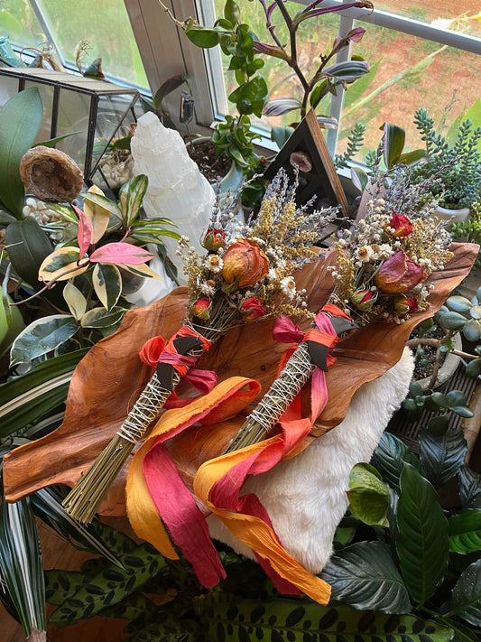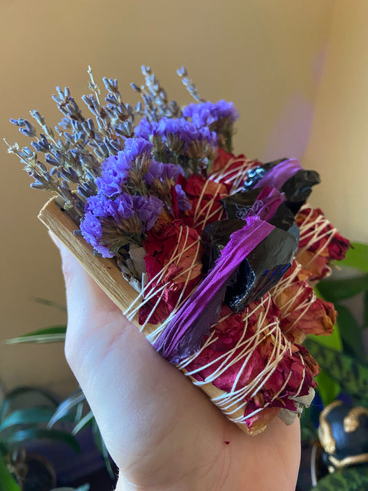 Protection & Love Smudge Bouquet – Dried Lavender, Roses and Marigolds with Shungite Moon Pendant | Grounding Self-Care Gift