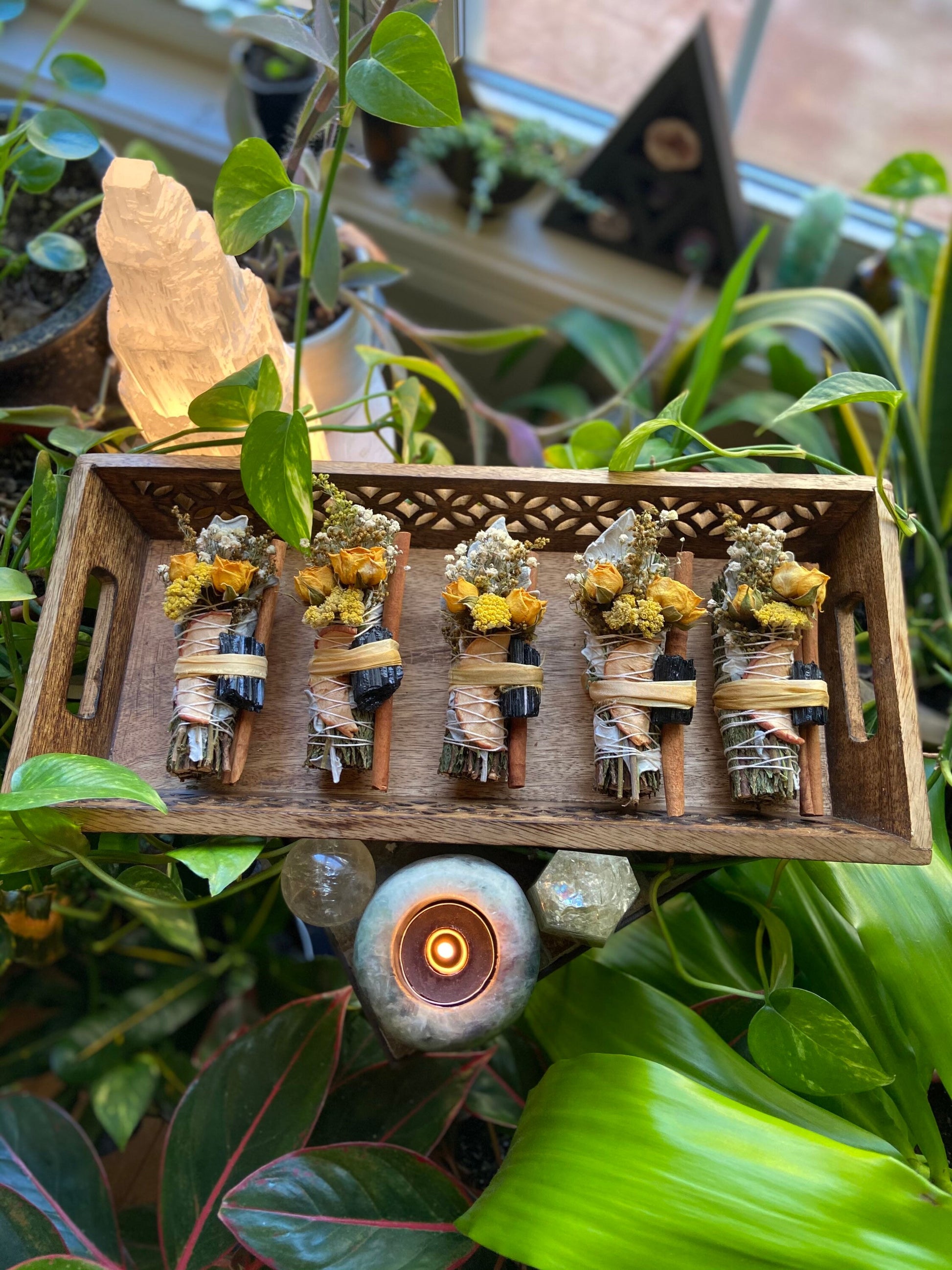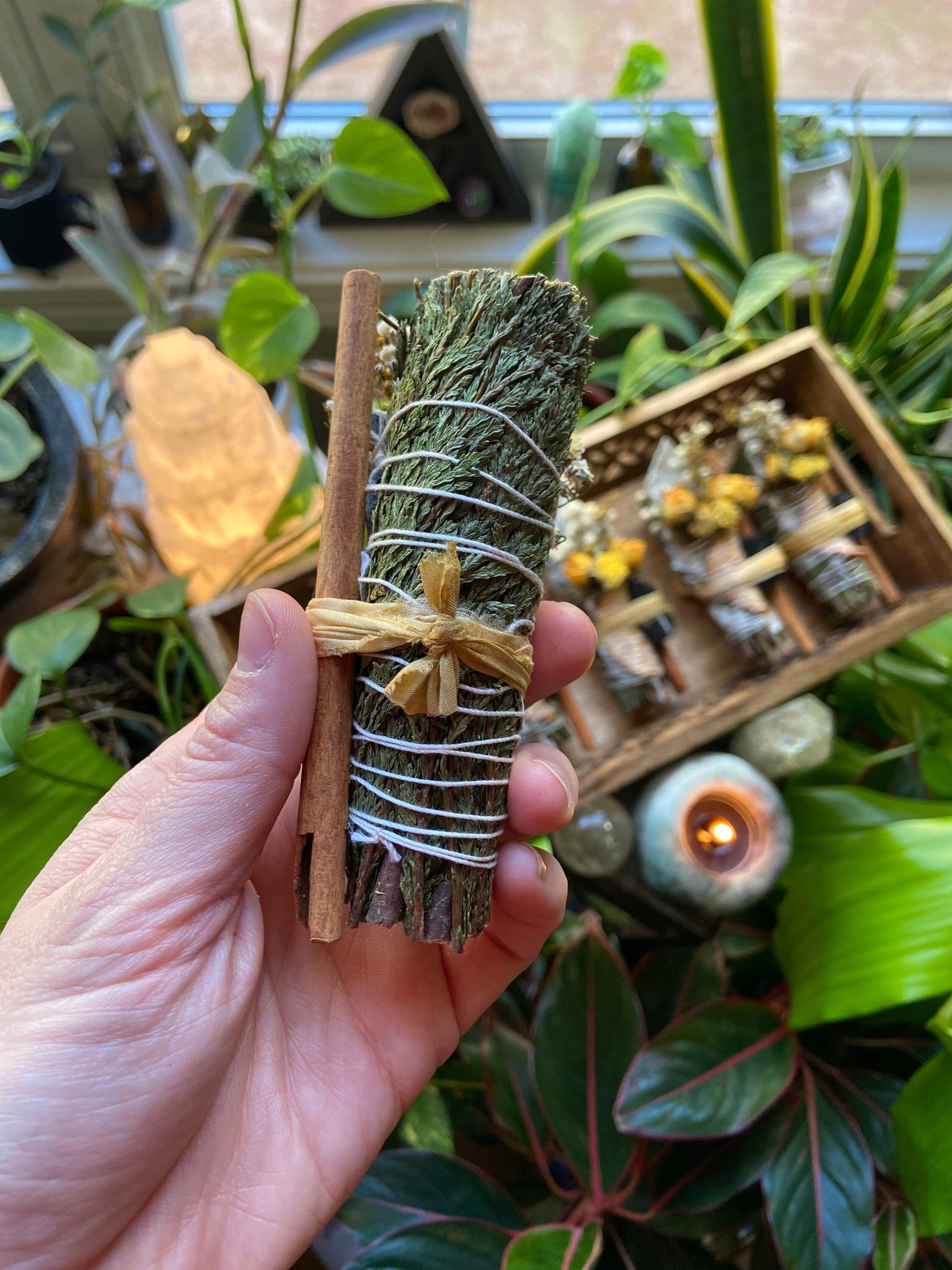 Manifest love, protection, and dispel negativity in your life and heal your Base chakra while cleansing your space with a beautiful and fragrant smudge stick bundle! . . Each bundle includes: I 4 inch Cedar bundle, dried Yarrow flowers, babys breath, goldenrod, yellow roses, dusty miller leaf, a dried apple slice, and a piece of Black Tourmaline tied on with recycled sari silk and a cinnamon stick ๐ค๐ผ๐ฒ๐๐โจ๐ . .