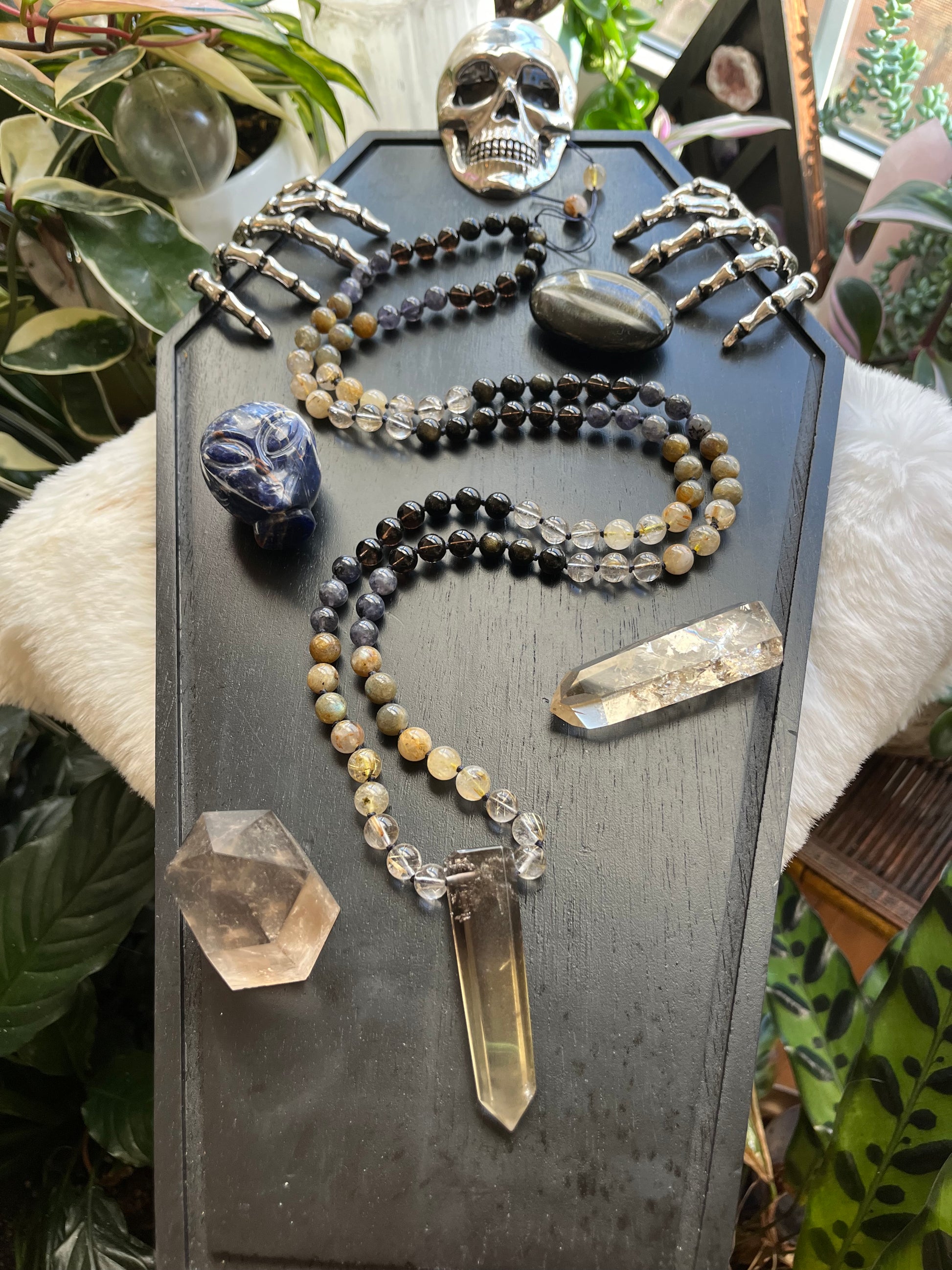 Dark & Mysterious this mala necklace is perfect for the darker half of the year to support the wearer with grounded energy, connection to deeper intuition, and connecting with inner joy and clarity 🫶💙🖤🩶