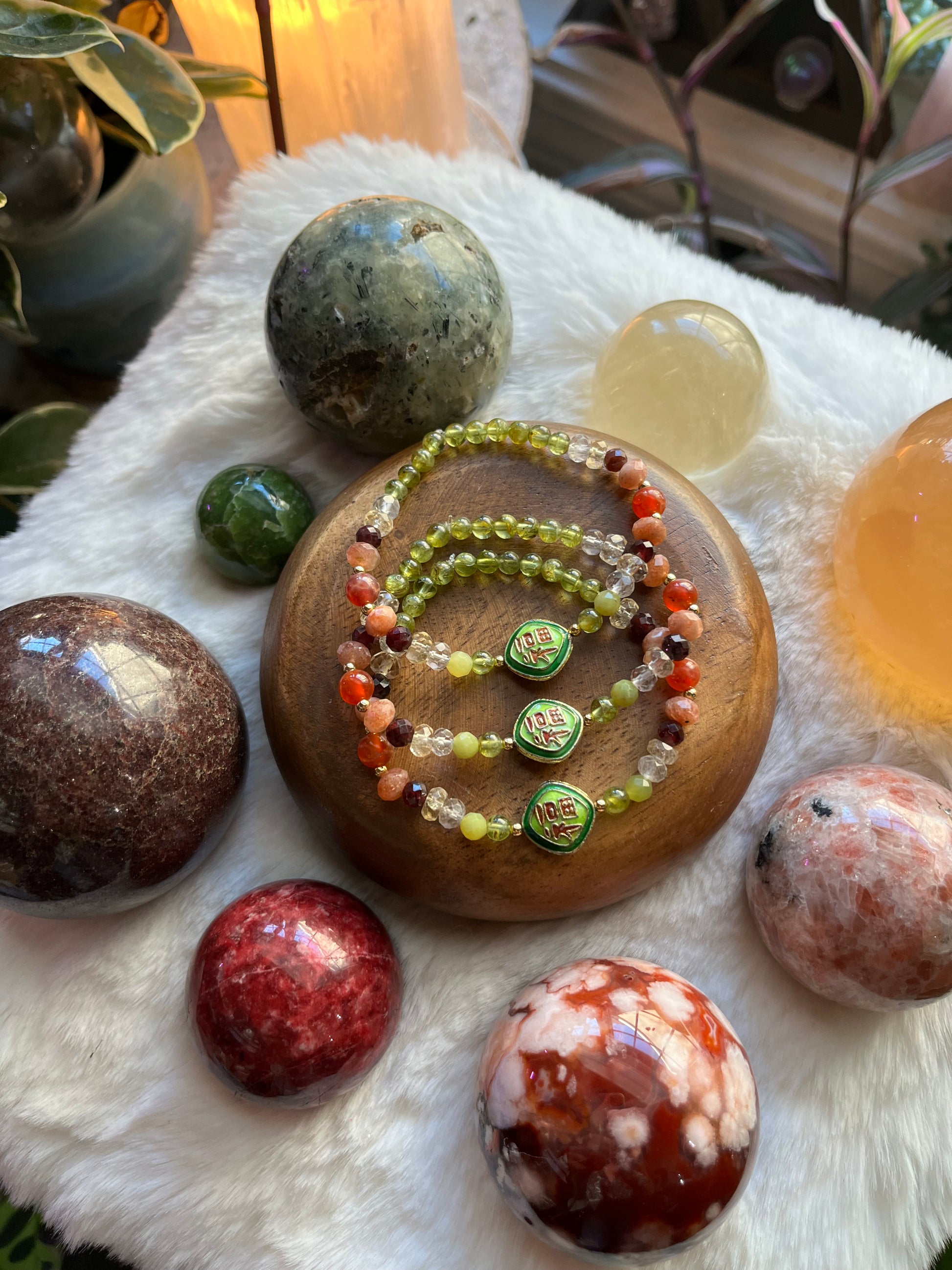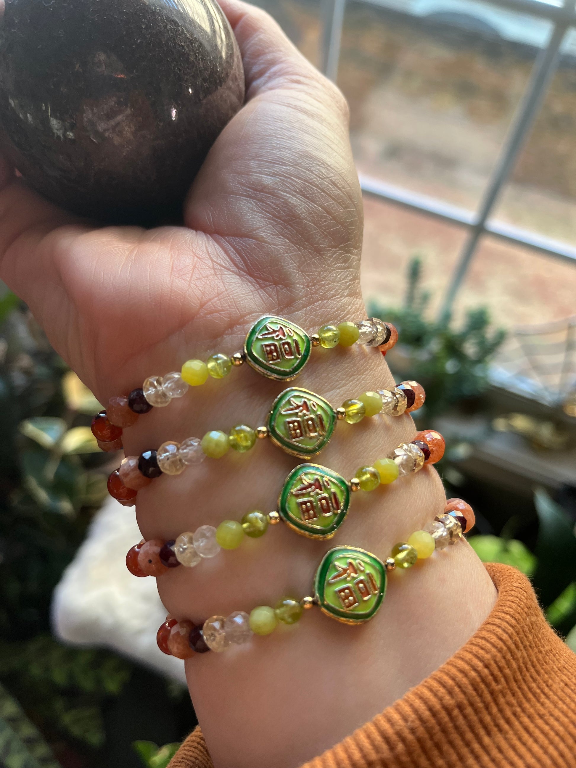 Made with: Peridot, Lemon Jade, Gold Rutile Quartz, Citrine, Garnet, Sunstone, and Carnelian with a gorgeous “Good Fortune” in Chinese characters enamel bead center 🧧✨