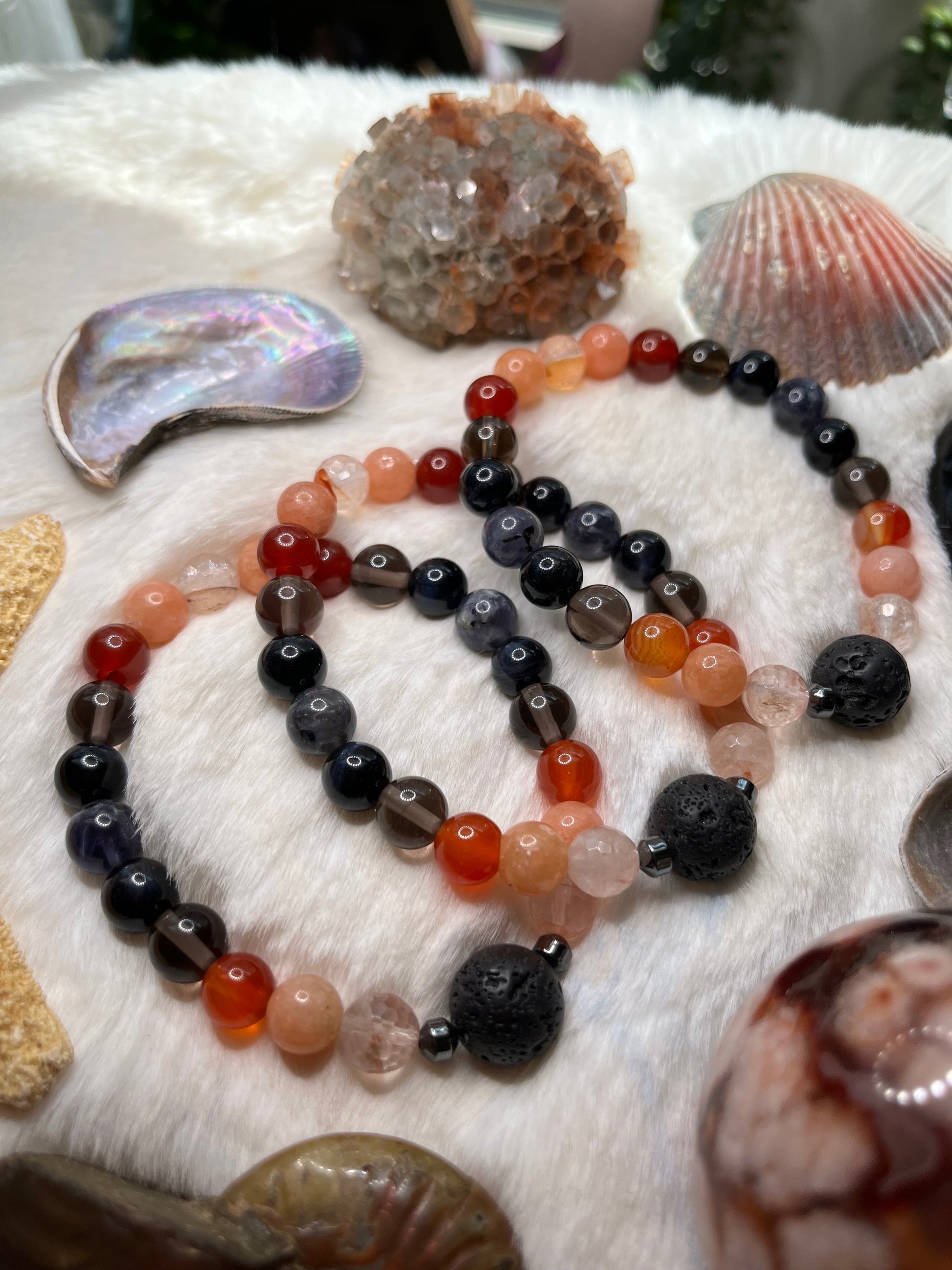 Surrounded by gorgeous beads: Hematoid (fire) Quartz, Peach Calcite, Carnelian, Blue Tigers Eye, Iolite, and Ice ObsidianβοΈππΏπ