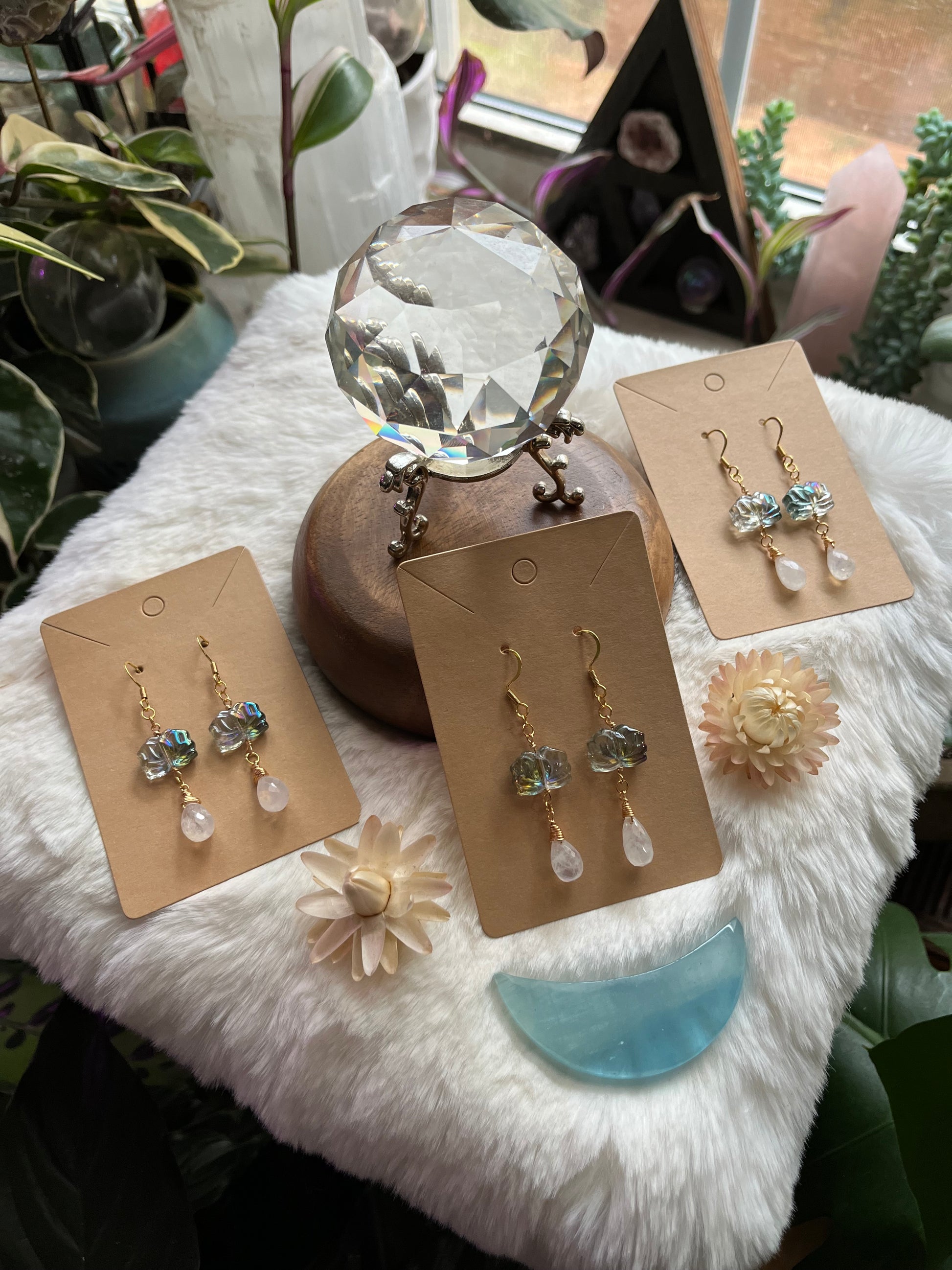 Beautiful Czech glass Lotus and Rainbow Moonstone dangle earrings on 14k ear wires