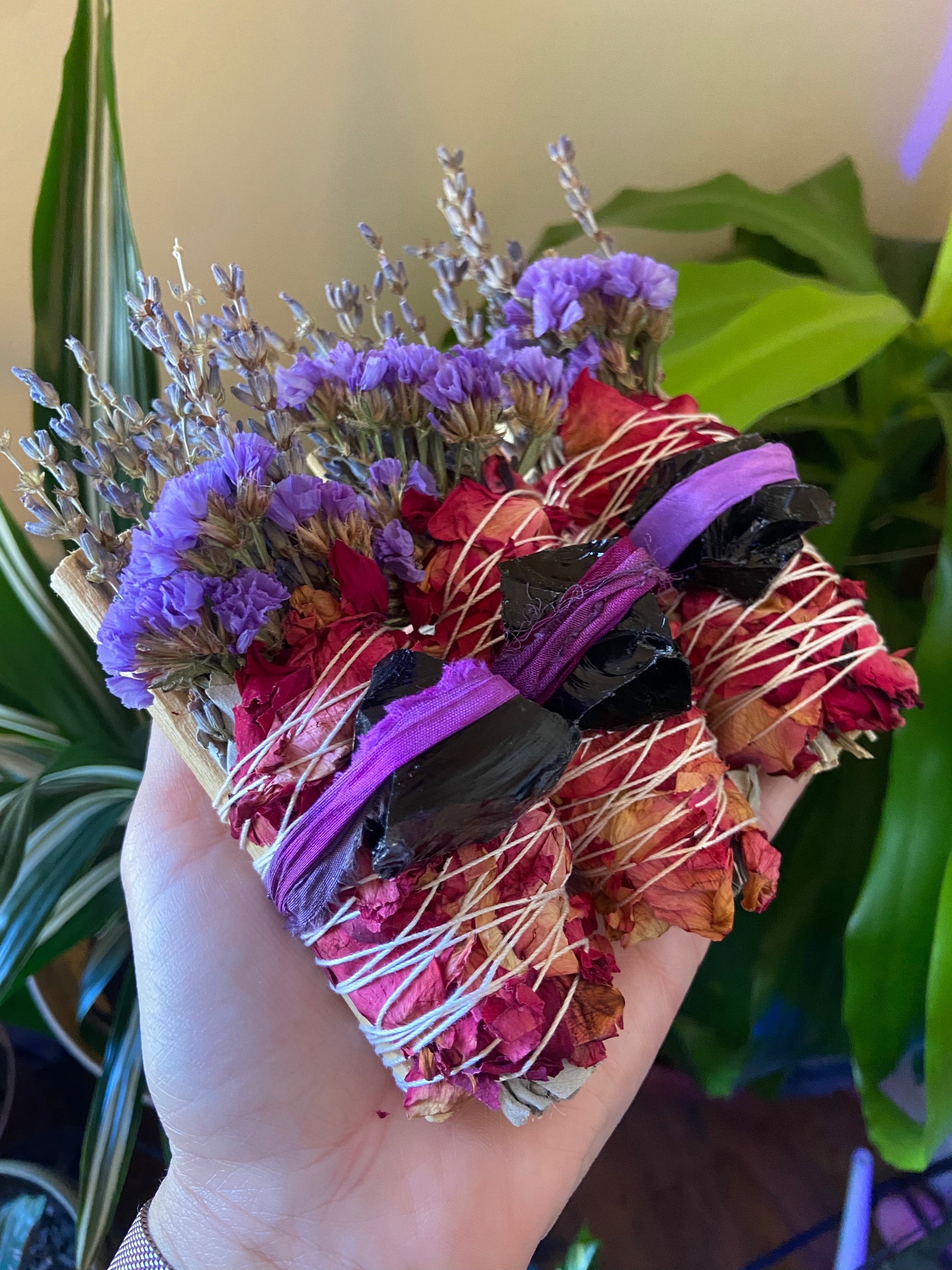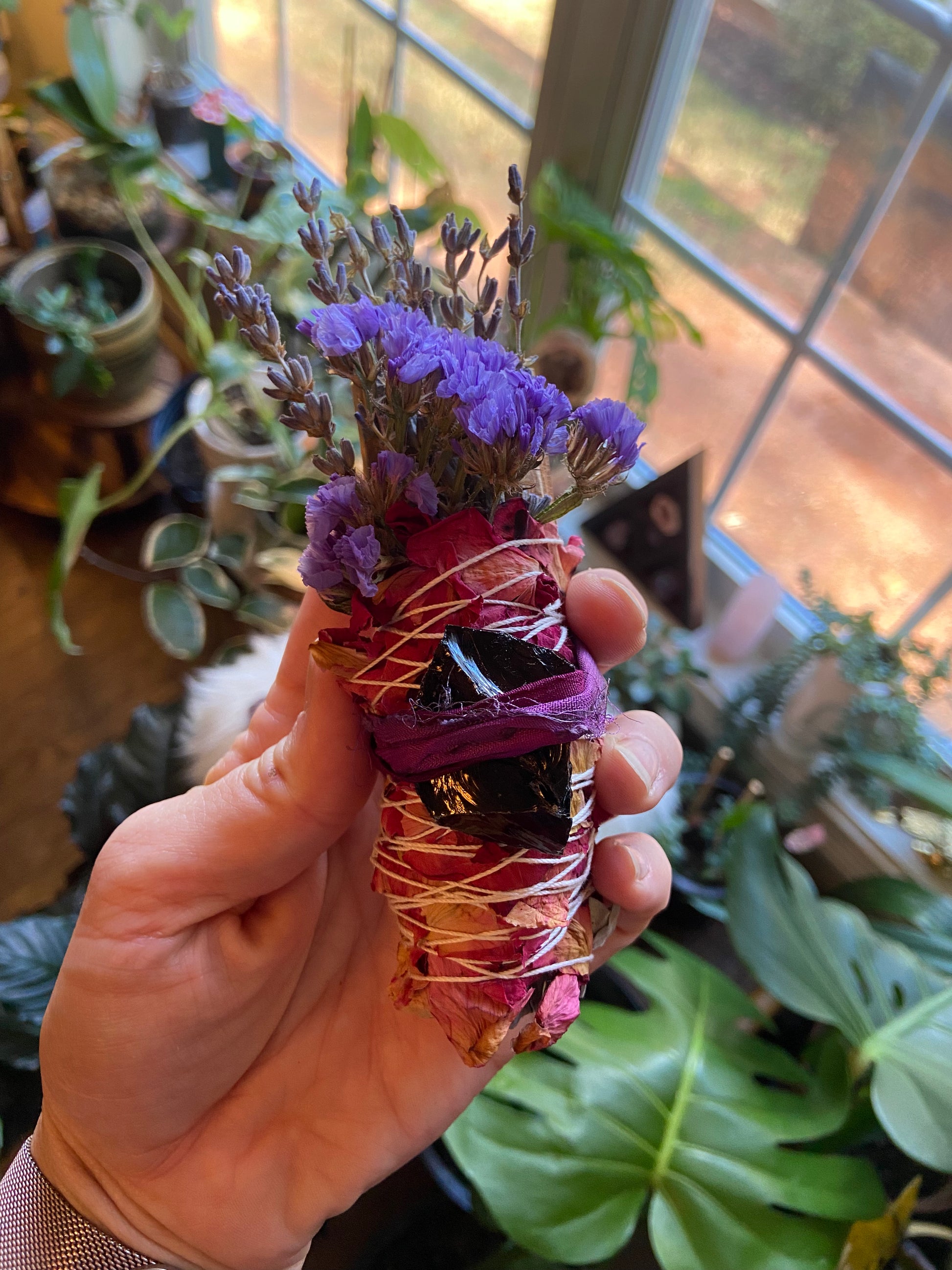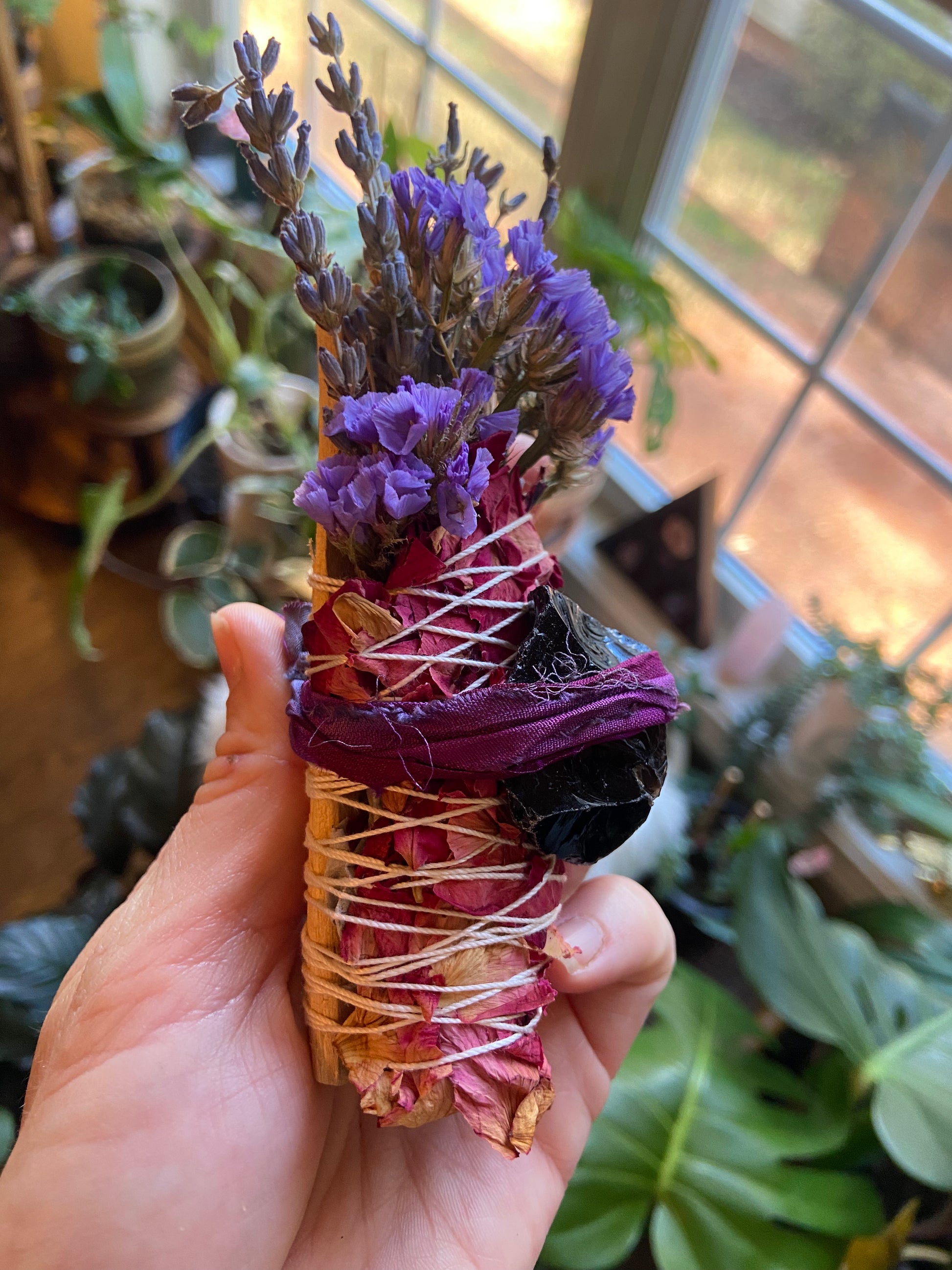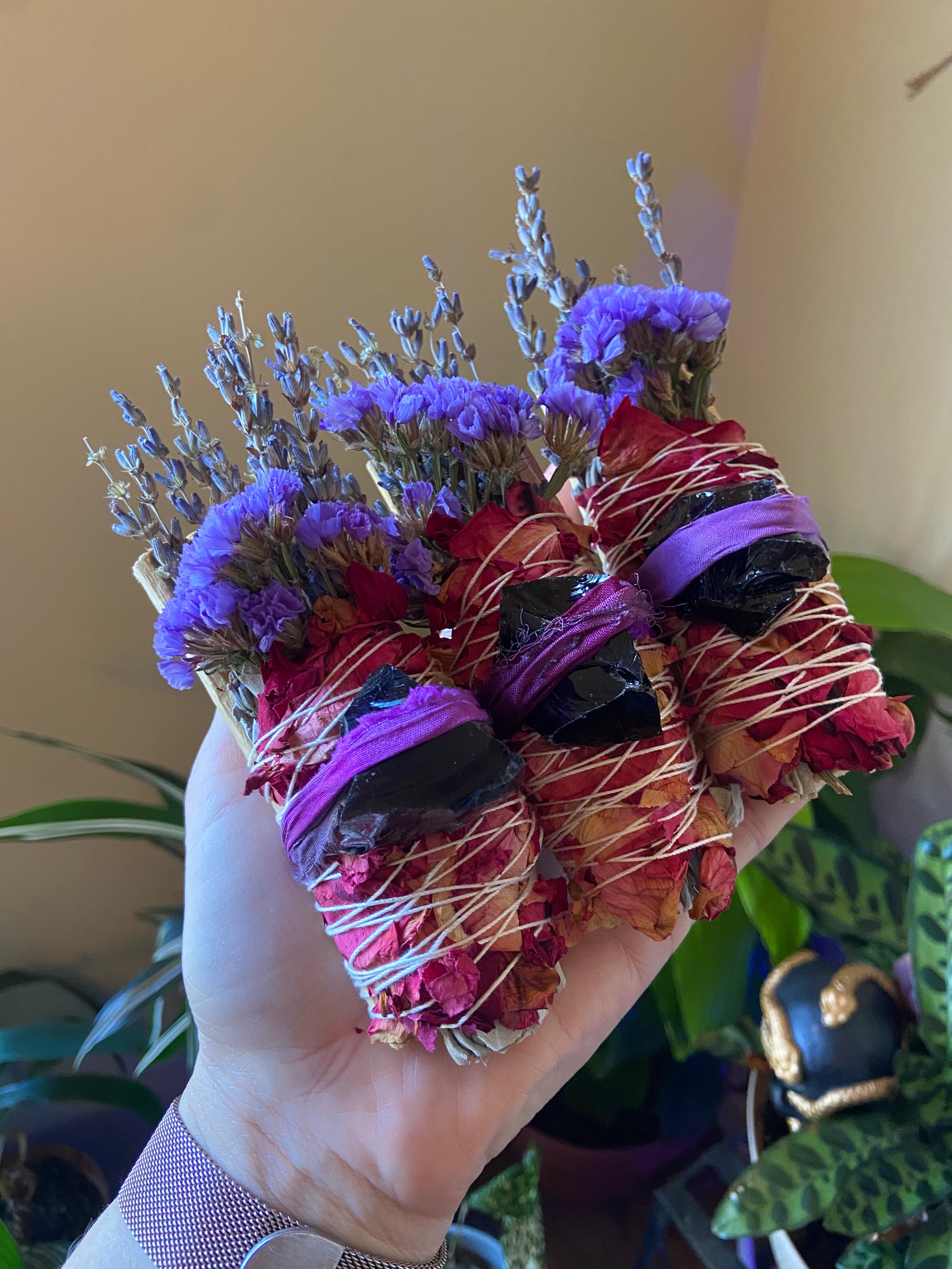 Made with: Farm grown Palo Santo, Farm grown sage, Rose petals, lavender, and purple statice and a piece of obsidian tied on with recycled sari ribbon 🪵🌱🌹💜
