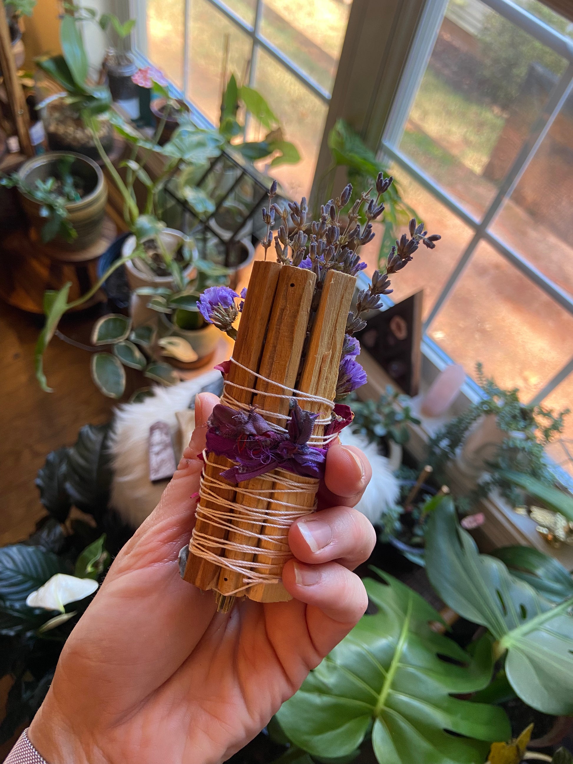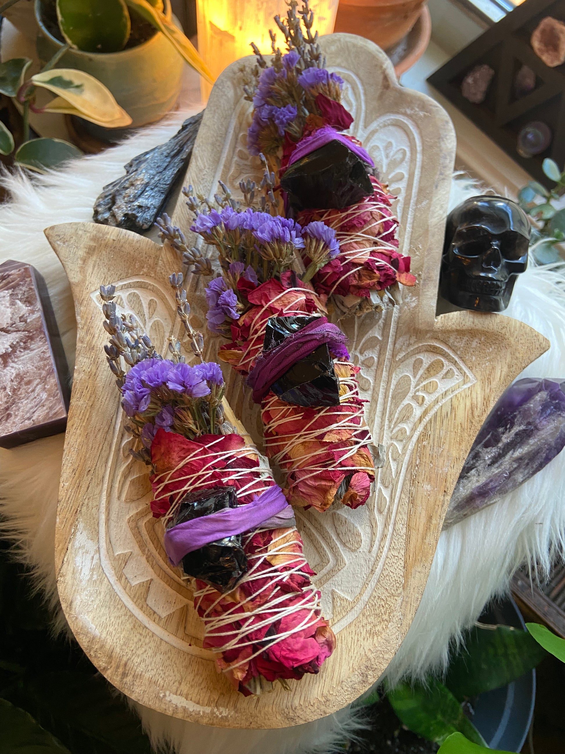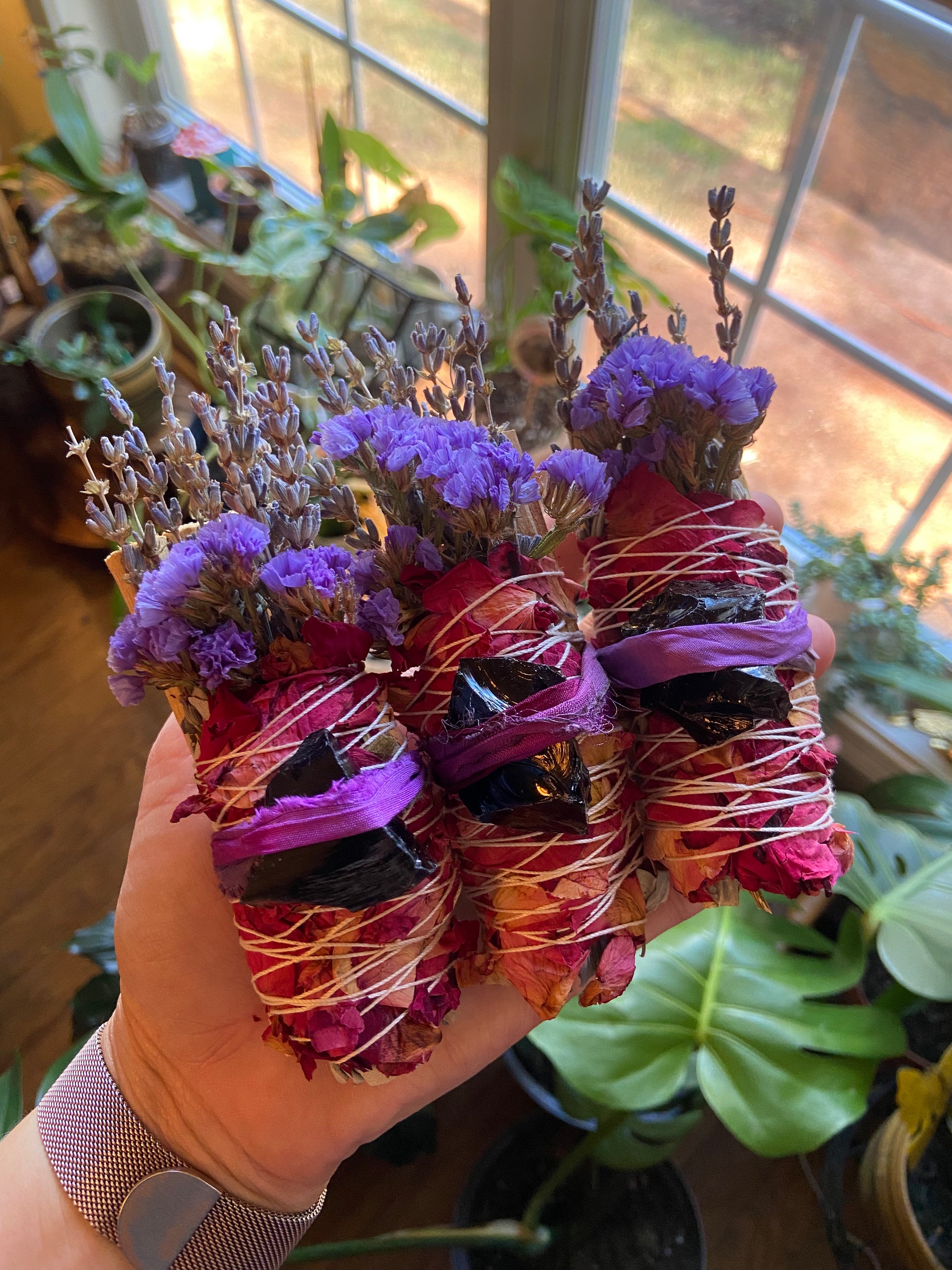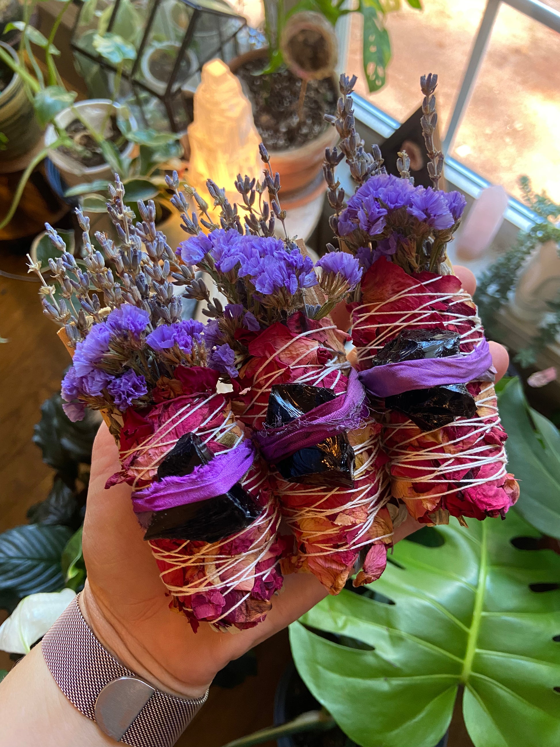 Made with: Farm grown Palo Santo, Farm grown sage, Rose petals, lavender, and purple statice and a piece of obsidian tied on with recycled sari ribbon 🪵🌱🌹💜