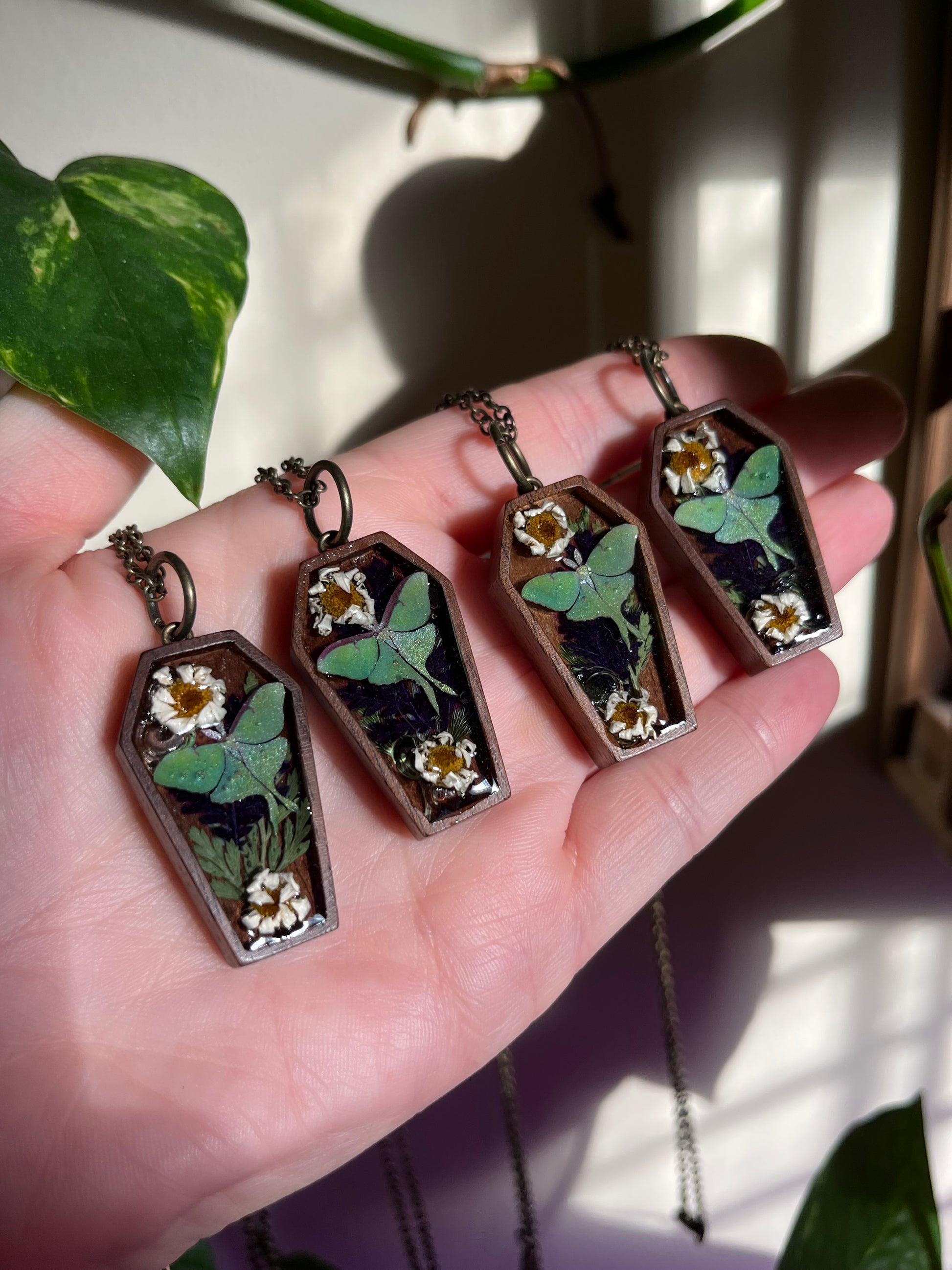 Made with real preserved flowers and cutout luna moths from (Moth and Myth)