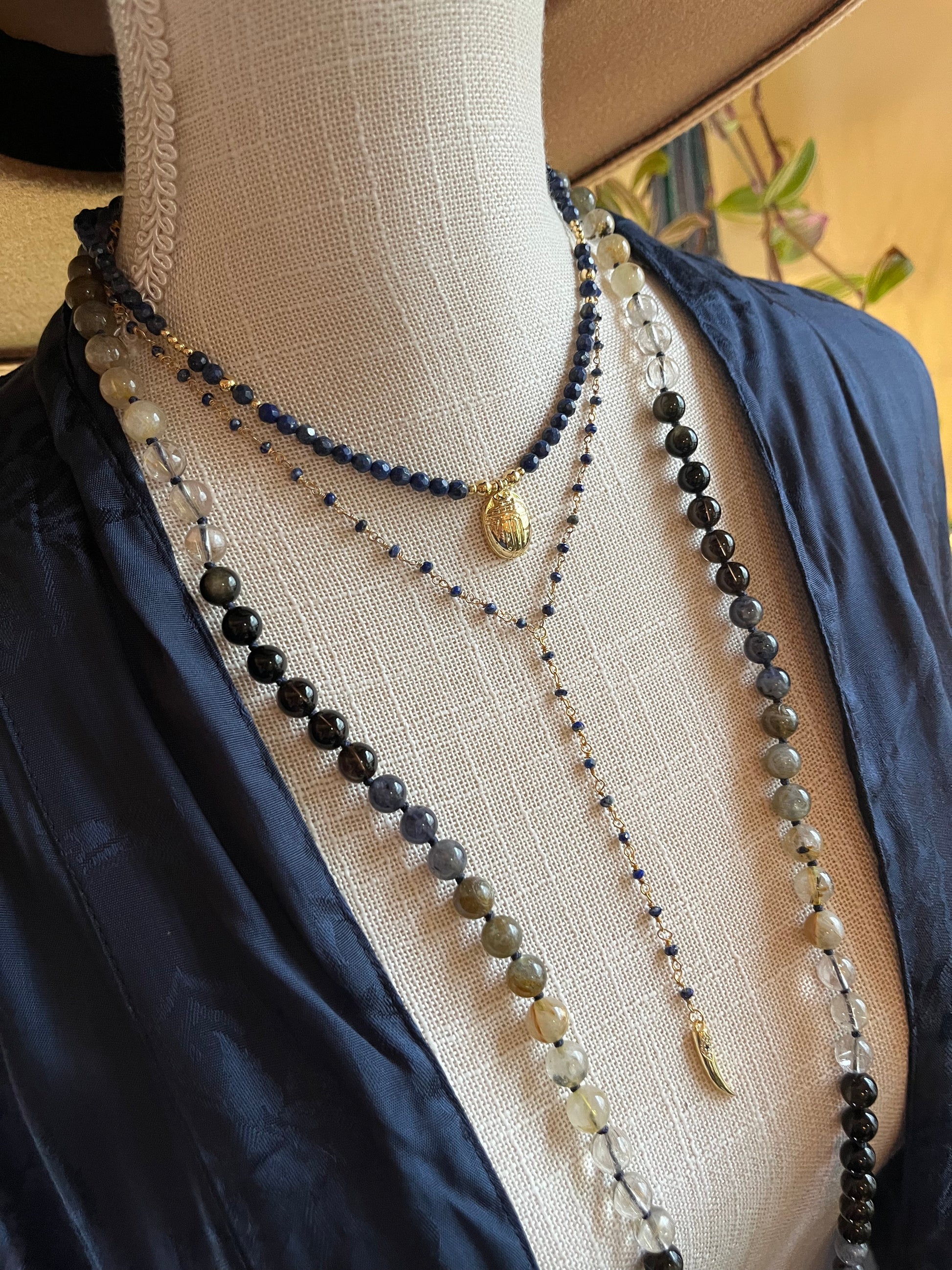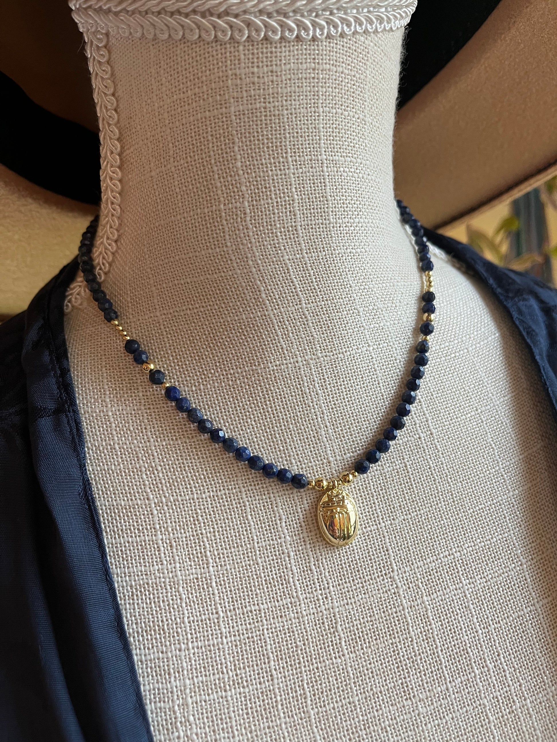 Beautiful hand strung luxe Lapis Lazuli necklace with gold filled Egyptian scarab charm, gold filled accent beads, and gold filled extender chain and clasp✨💙🪲