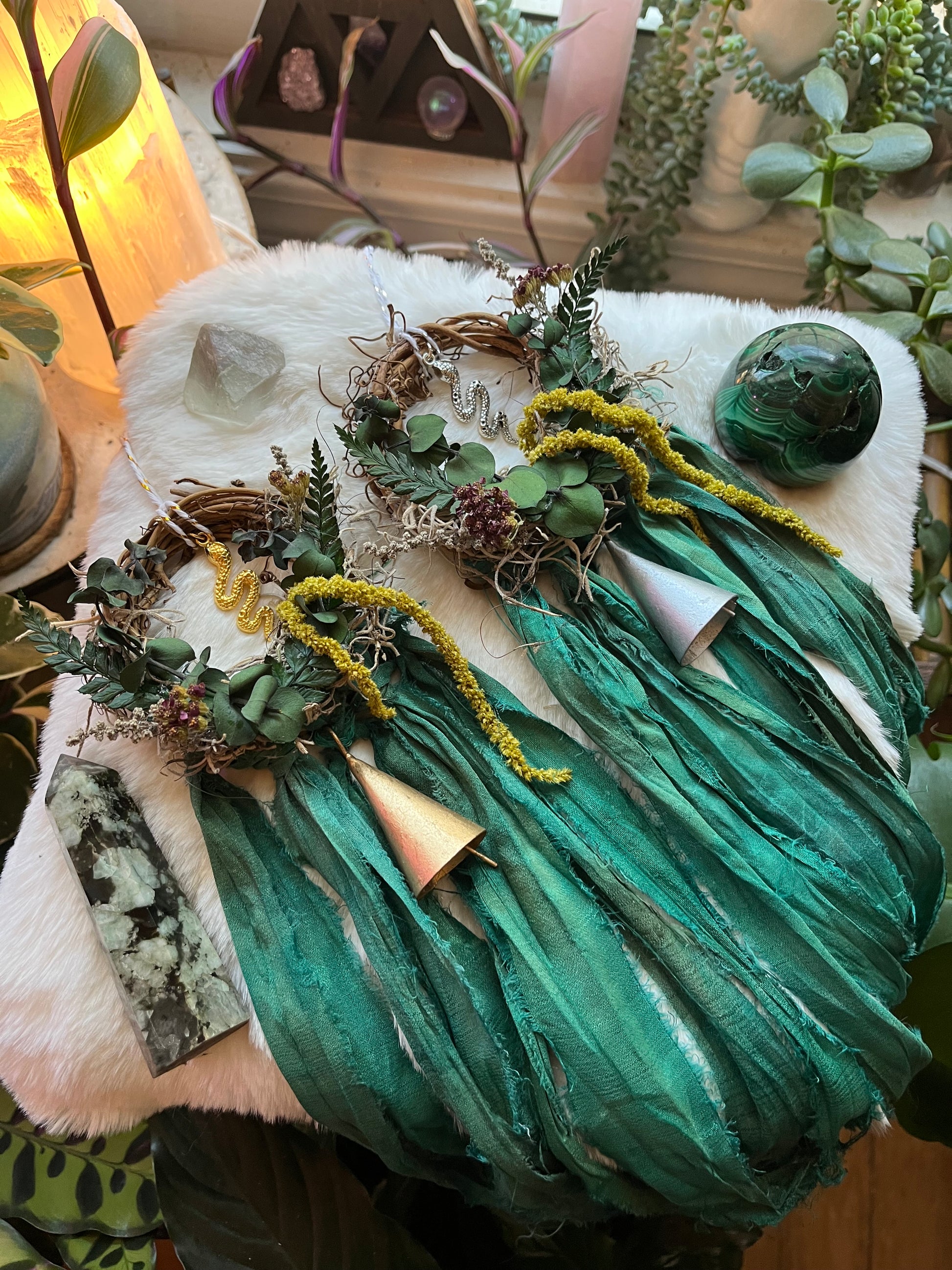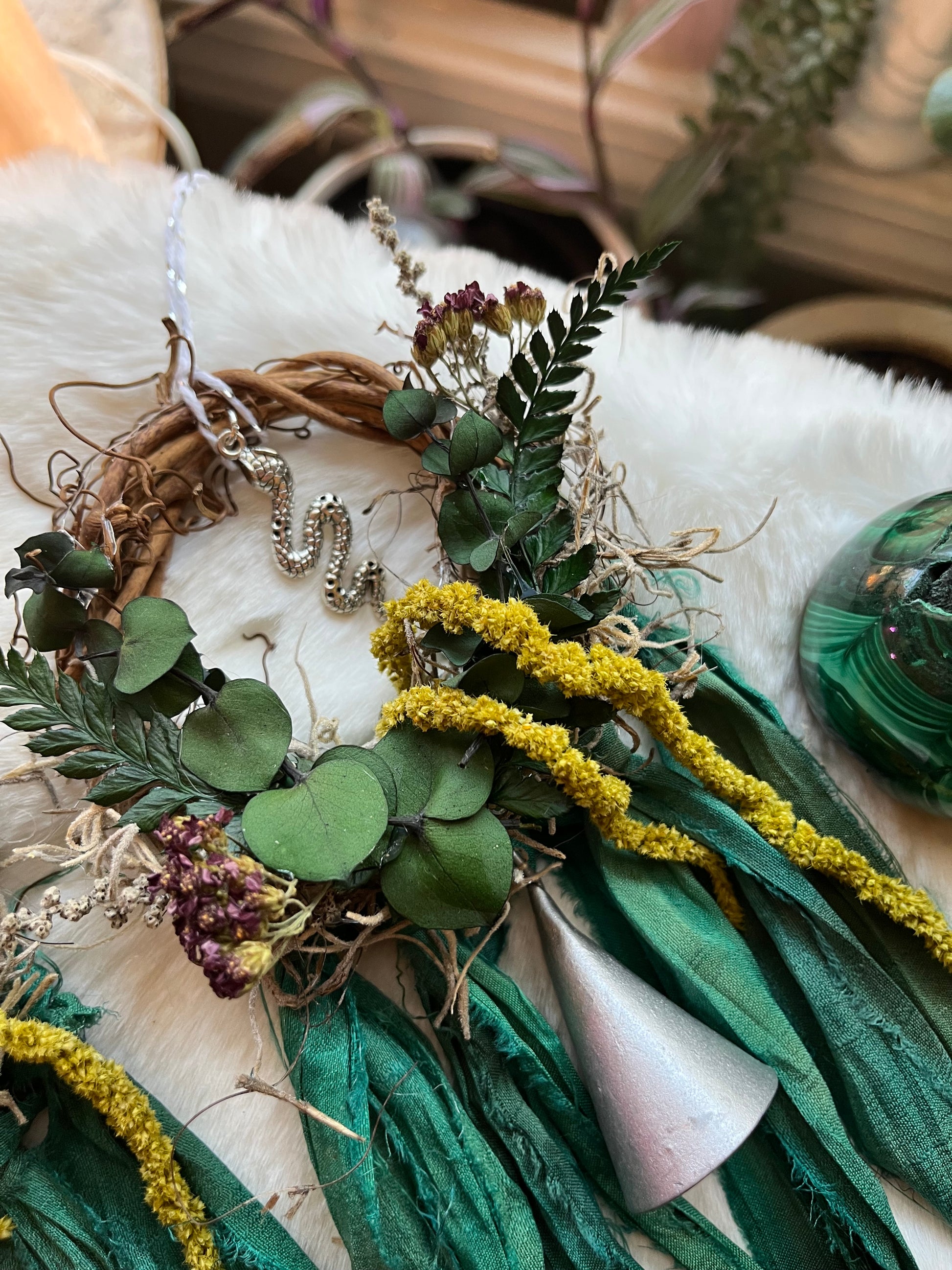 Made with beautiful oxidized metal bells, recycled sari ribbon in forest green, a silver/gold snake charm, preserved ferns, amaranthus, yarrow flowers, and eucalyptus ππβ¨πΏπ€π²