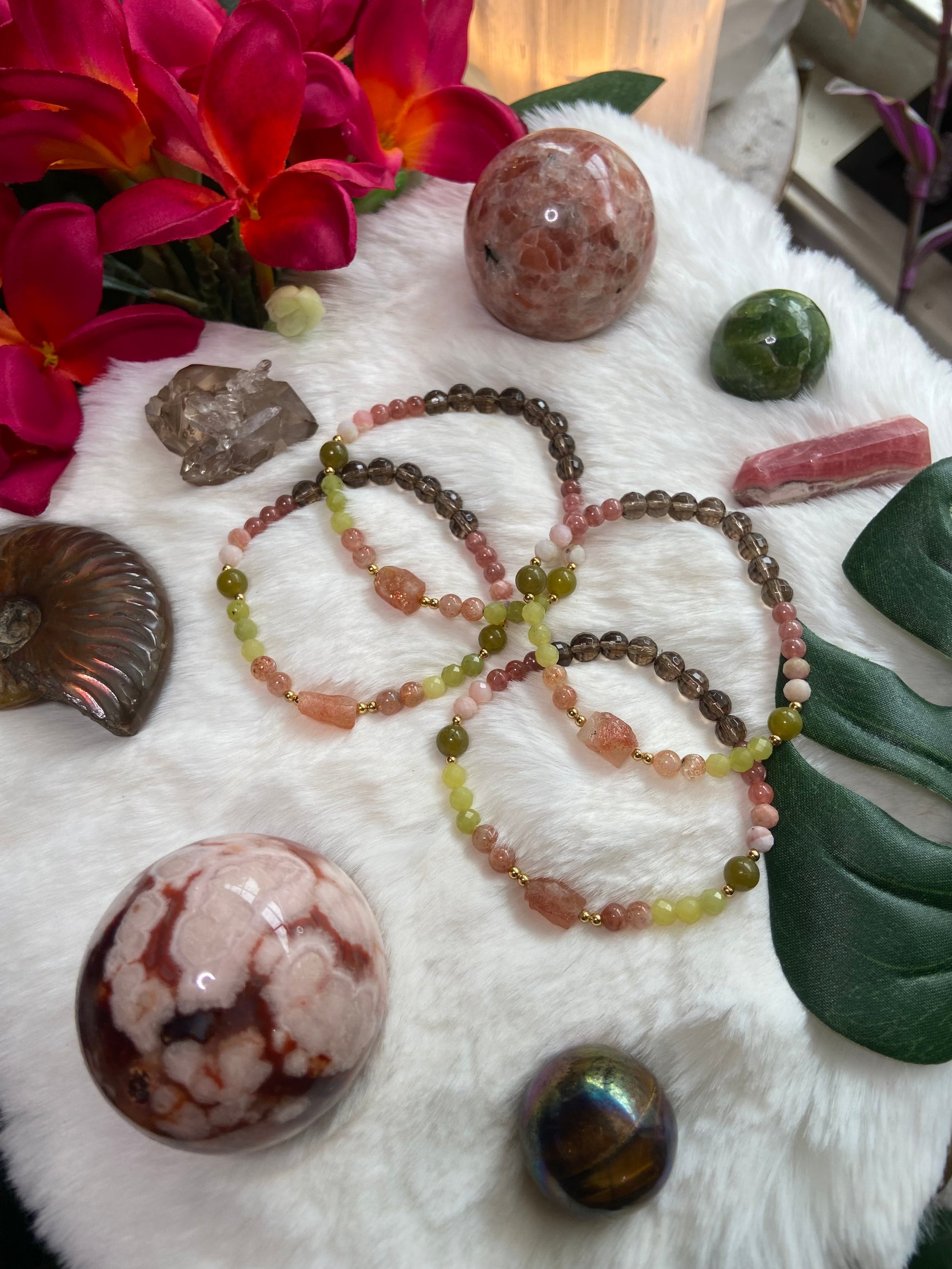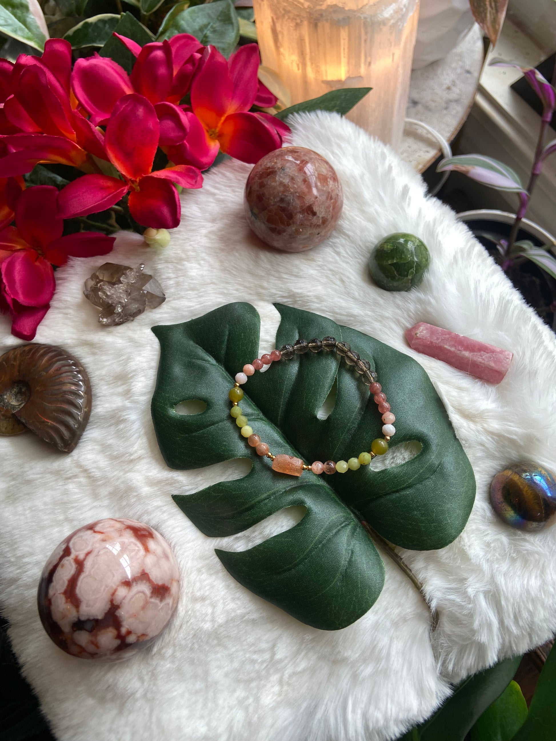 •Made with Sunstone, Green Jade, Olive Jade, Pink Opal, Rhodochrosite, and Smoky Quartz with a sparkly raw sunstone focal 🐦🩷🌸💚🌴🤎🐚