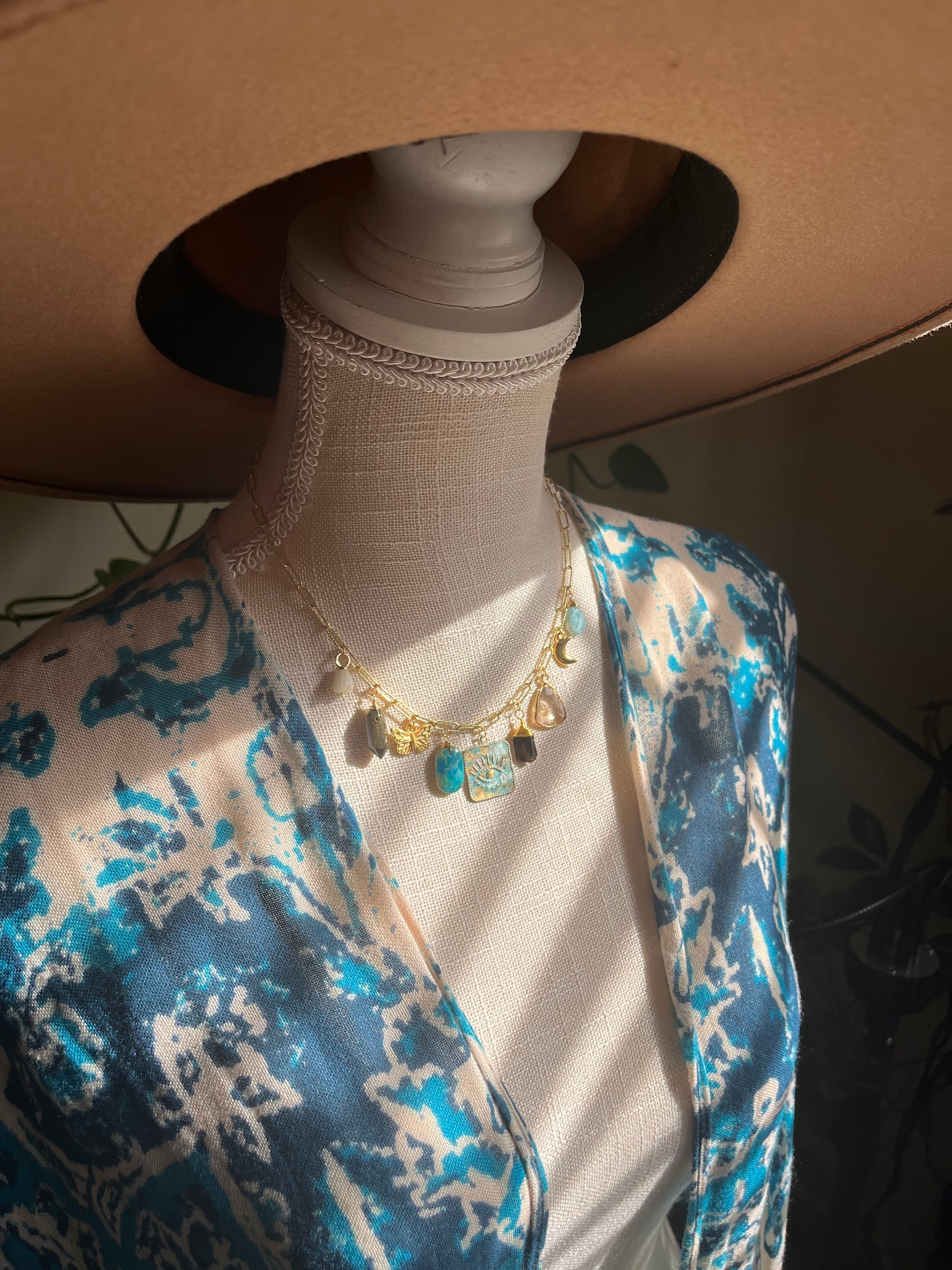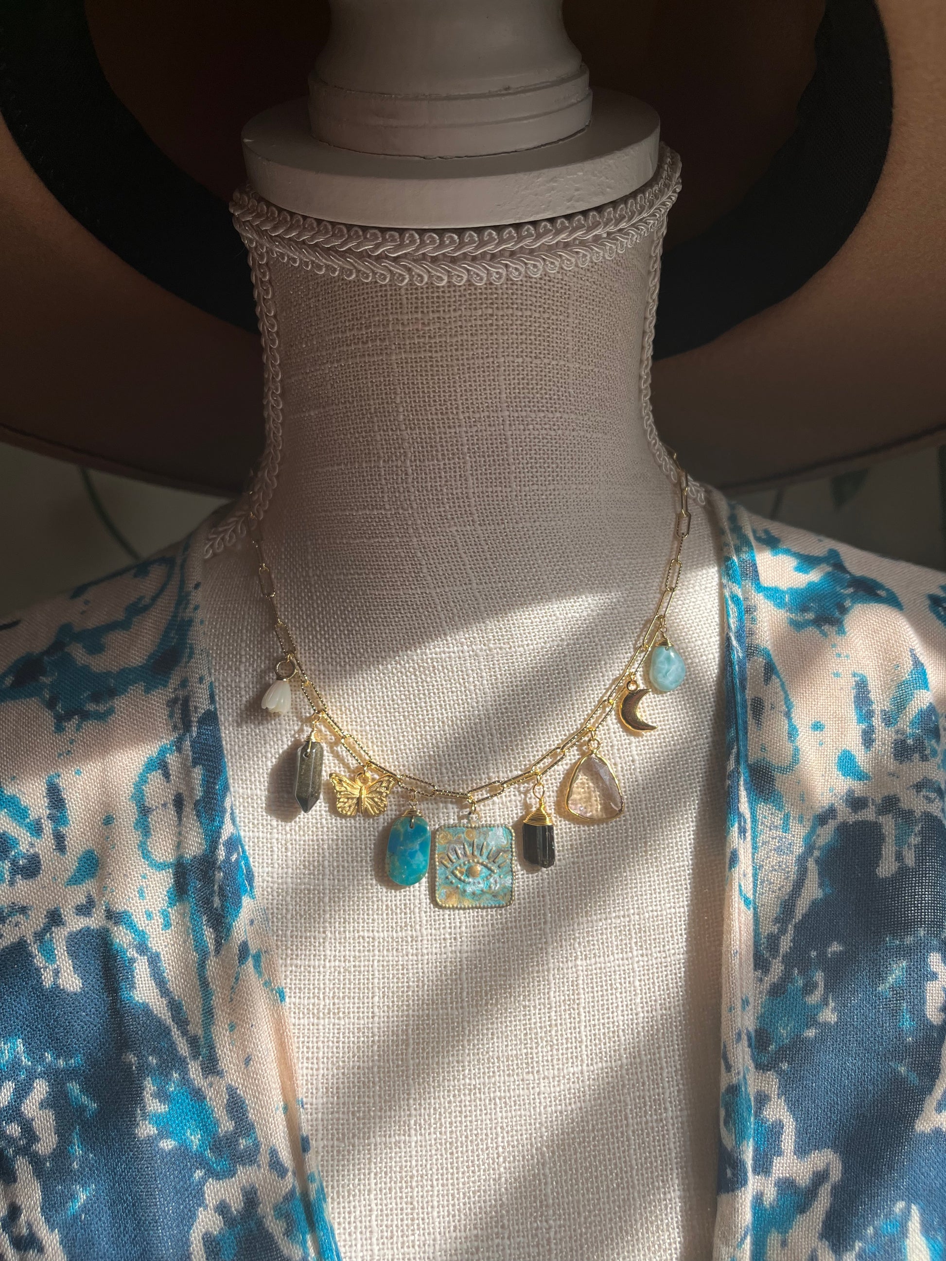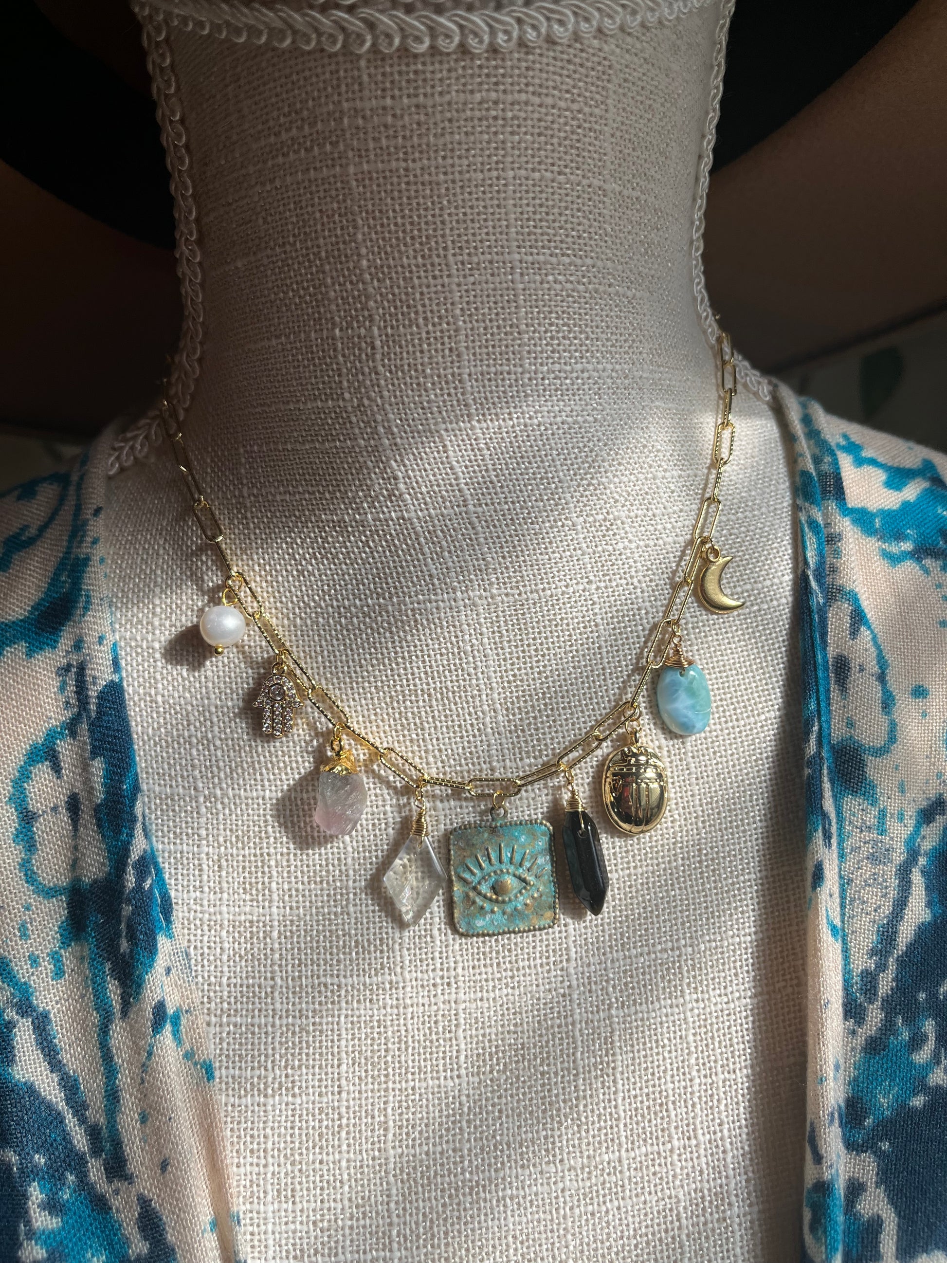 Elevate your style with a Talismans Charm Necklace—a hand-curated blend of rare gemstones and sacred symbols strung on a subtle gold-filled chain. Each style is one-of-a-kind, carrying energies of clarity, love, intuition, and protection. Choose from pearl flower to larimar or tourmaline talismans—or request your own unique combination—to express your highest vibe.👁️🩵💎