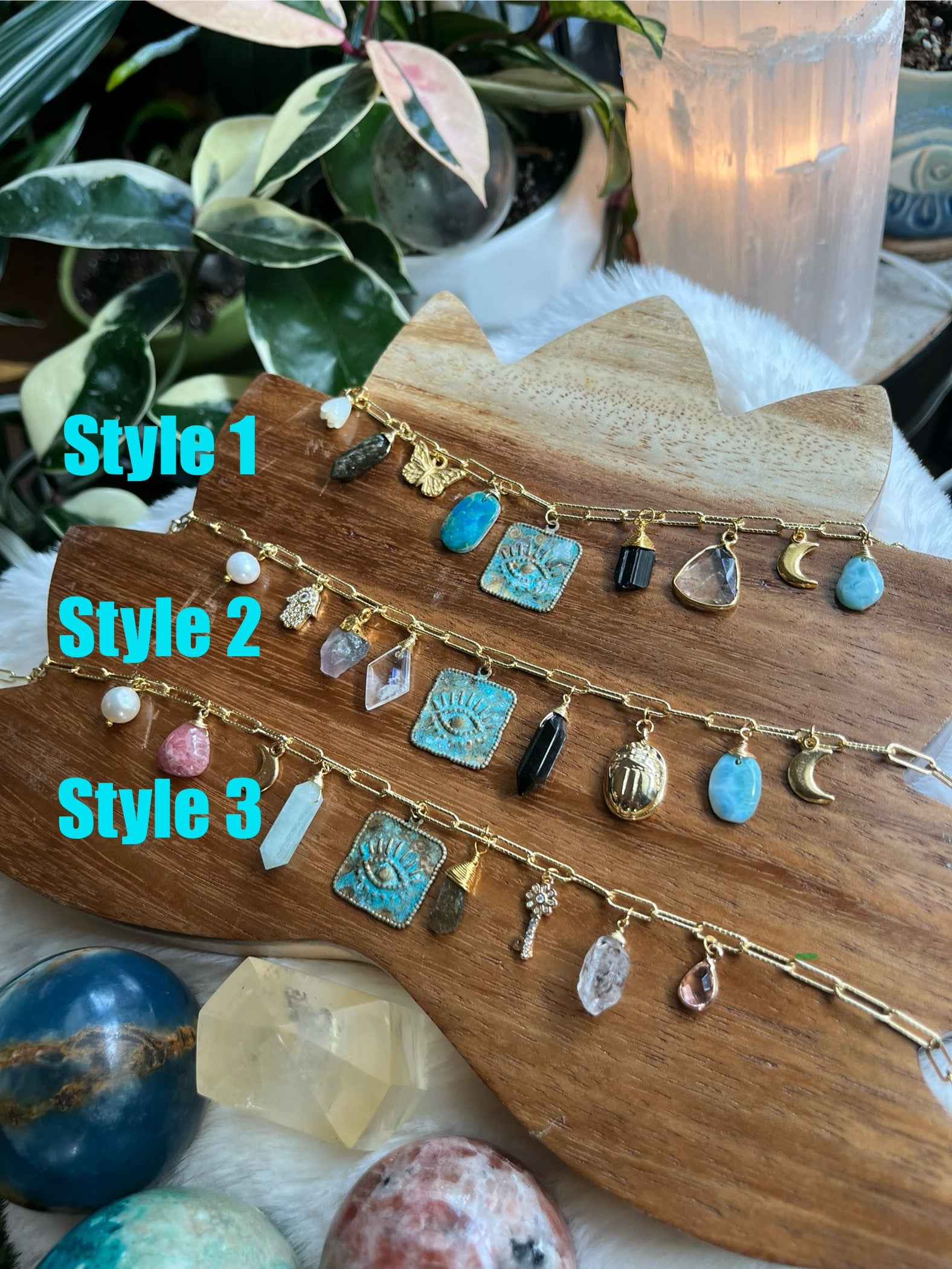 Style 1: Pearl flower, Gold Sheen Obsidian, 18k butterfly, Shattuckite, Patina brass eye, Tourmaline, Ametrine, 18k moon, Larimar