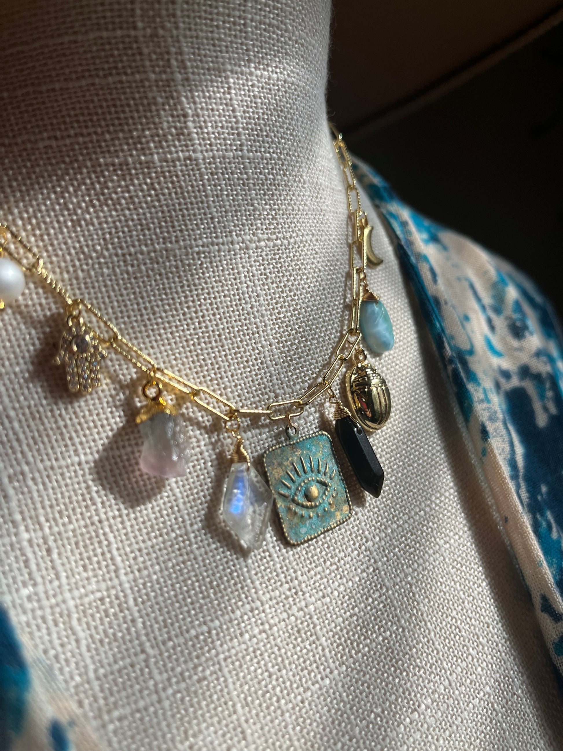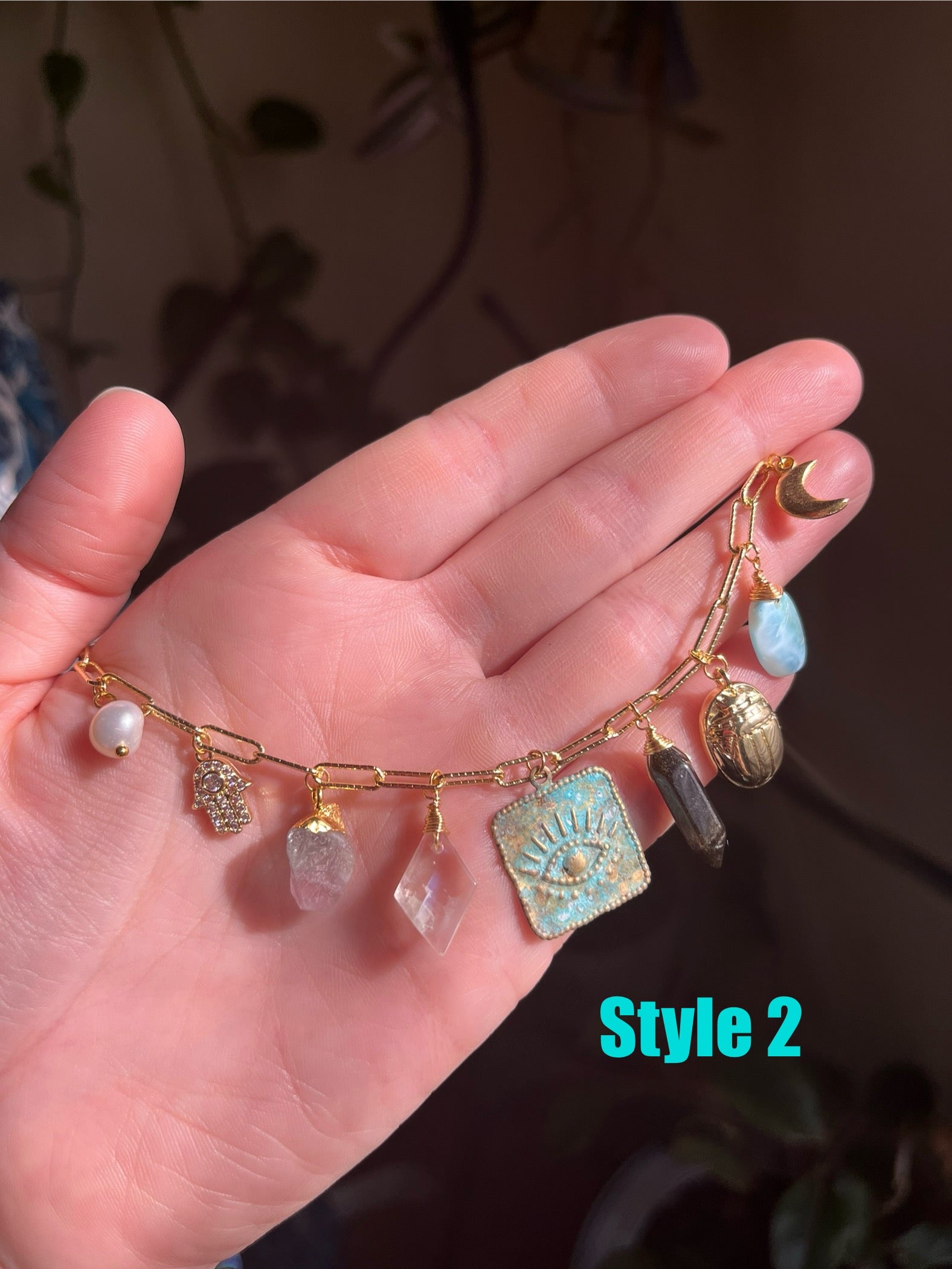 Style 2: Pearl, Cz Gold fill Hamsa, Rainbow Fluorite, Rainbow Moonstone, Patina brass eye, Gold Sheen Obsidian, Gold fill Scarab, Larimar, 18k Moon