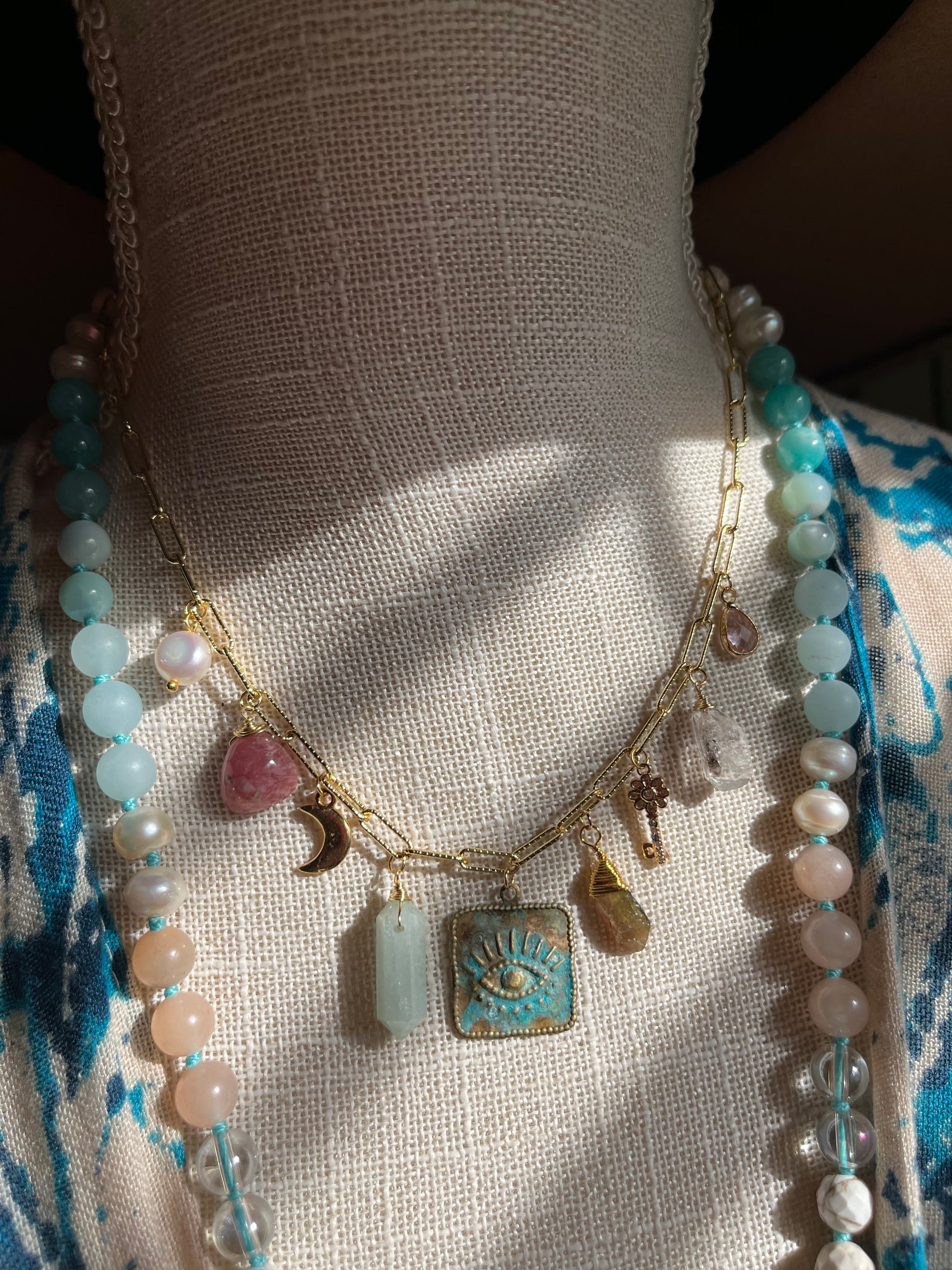 Style 3: Pearl, Rhodochrosite, 18k moon, Aquamarine, Patina brass eye, Tourmaline, CZ gold fill key, Herkimer Diamond, Pink CZ droplet