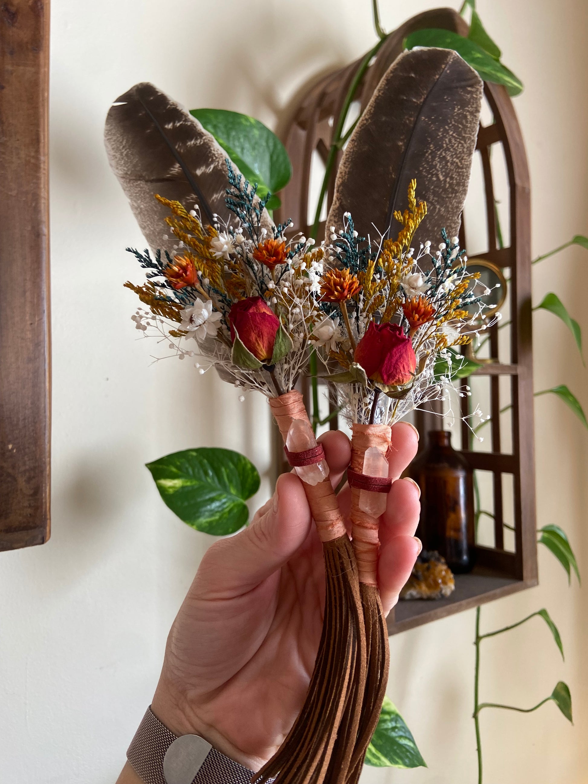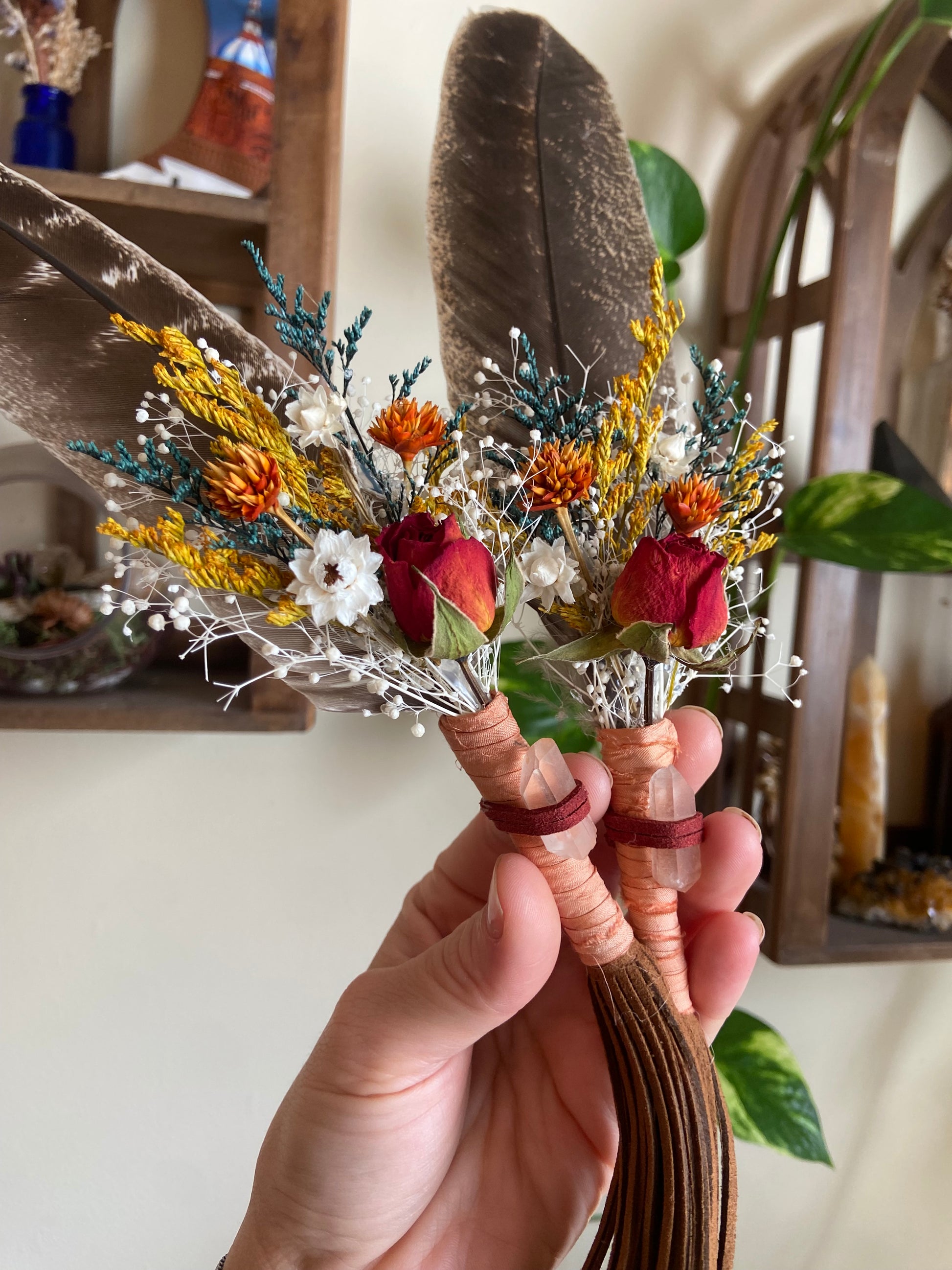 Made with dried flowers, crystals, vegan leather, and recycled sari ribbon these beauties are perfect for any altar space or special ceremony